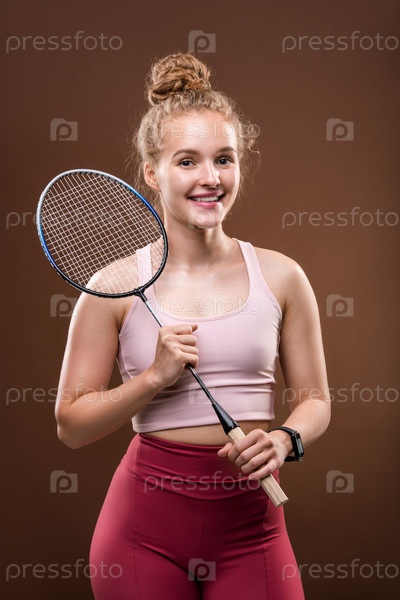 Красивая девушка в спортивной одежде держит теннисную ракетку и смотрит на тебя с улыбкой