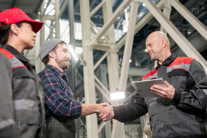 Голубой зрелый бригадир с цифровым планшетом приветствует своих двух молодых подчиненных
