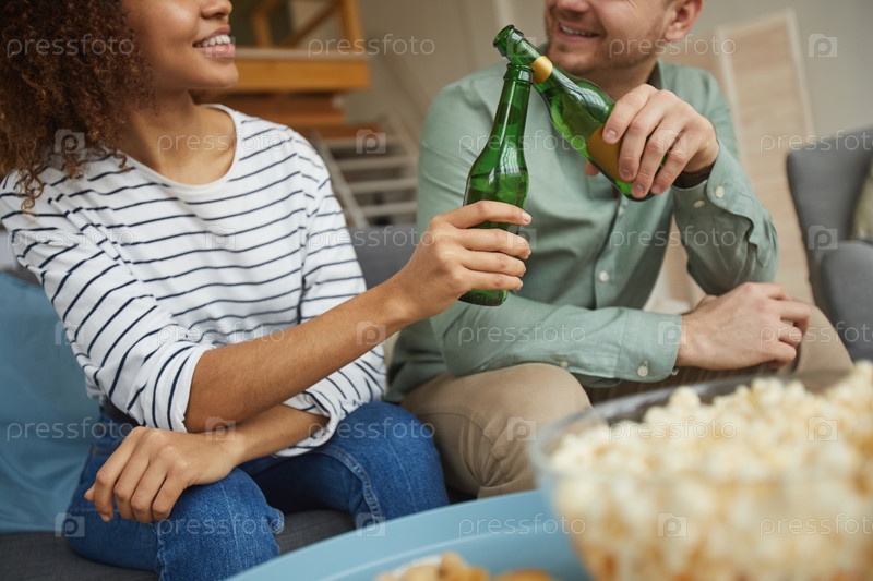 Молодая пара пьет пиво, пока смотрит телевизор дома