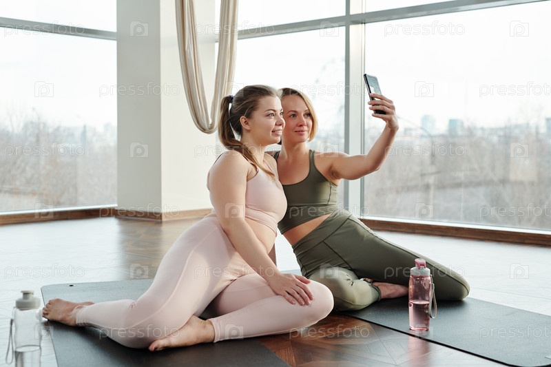 Две здоровые и великолепные женщины в спортивных костюмах делают селфи, сидя на матрасах