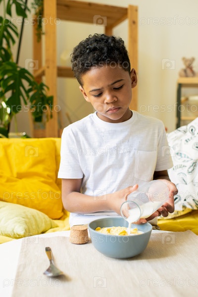 Милый африканский мальчик наливает молоко из бутылки в миску с кукурузными хлопьями