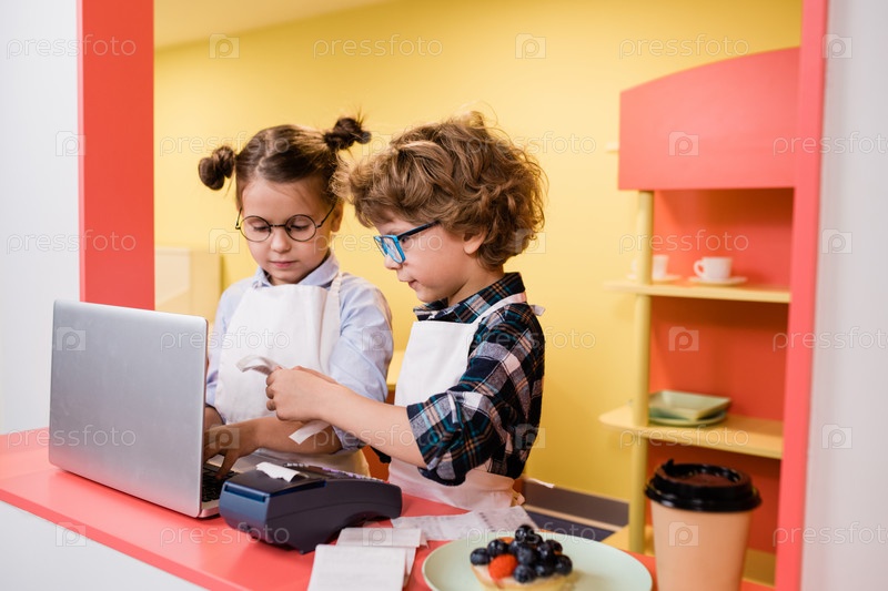 Милый мальчик показывает квитанции красивой девушке, вводящей информацию на ноутбуке