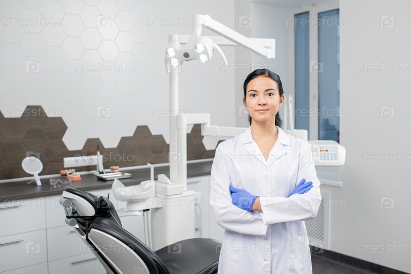 Молодая самоуверенная блондинка-стоматолог в белом пальто и перчатках