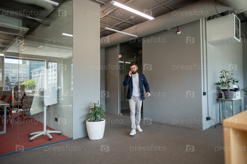 Молодой бизнесмен в умной повседневной одежде разговаривает по телефону во время въезда в офис