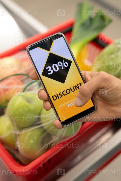 Рука современной зрелой покупательницы, показывающая вам онлайн-купон на скидку