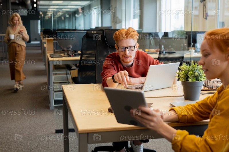 Молодой бизнесмен в повседневной одежде указывает на экран сенсорного панеля, который держит коллега