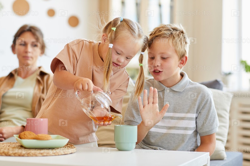 Девочка с синдромом Дауна наливает чай для семьи