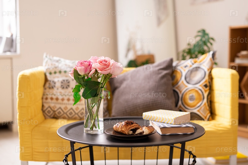 Две книги, свежий кроассан на тарелке и букет розовых роз в стакане воды