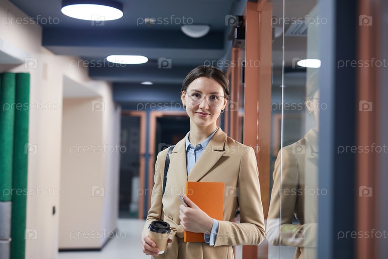 Элегантная деловая женщина позирует в офисном зале