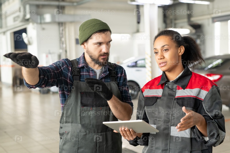 Молодой уверенный ремонтник в перчатках и рабочей одежде смотрит на свою коллегу