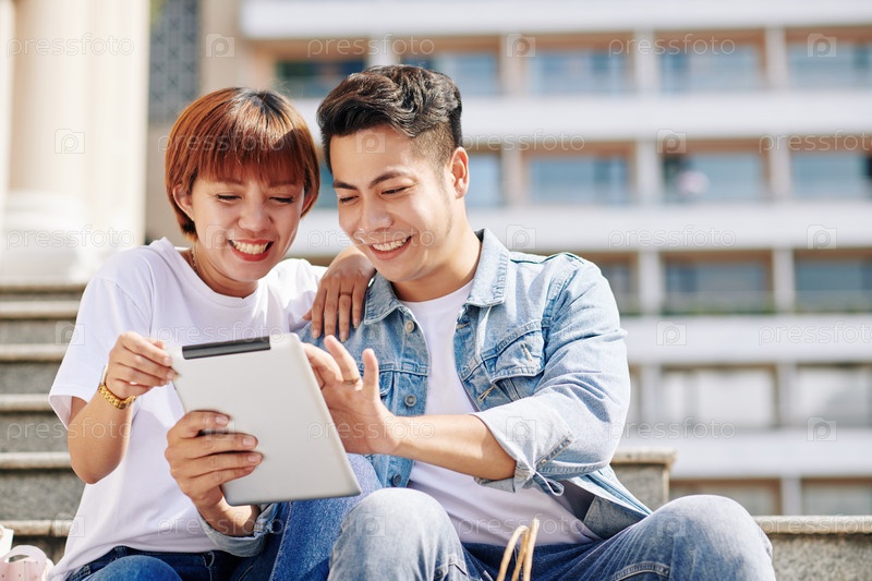 Пара, использующая планшетный ПК на открытом воздухе