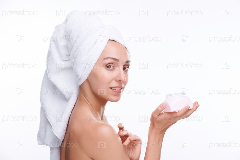 Красивая женщина с полотенцем на голове, держащая пластиковую банку с гладким кремом для тела