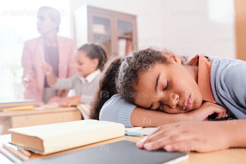 Измученная девушка держит голову на столе на фоне одноклассницы и учителя