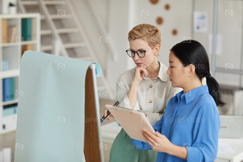 Женщины-бизнесмены пишут на доске в офисе
