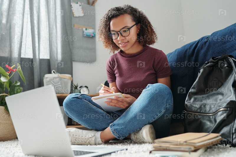 Молодой крестоногий студент сидит на полу рядом с кроватью перед ноутбуком