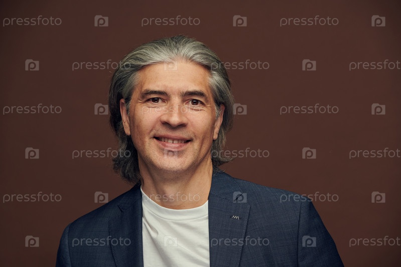 Портрет позитивного уверенного зрелого менеджера с седыми волосами, стоящего на коричневом фоне