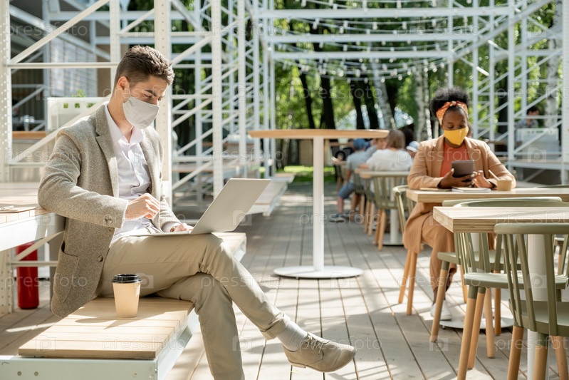 Молодой бизнесмен в защитной маске и формальной одежде смотрит на дисплей ноутбука