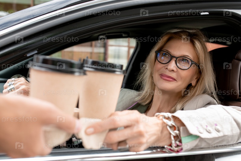 Зрелая женщина сидит у быка и смотрит на работника кафе с доставкой