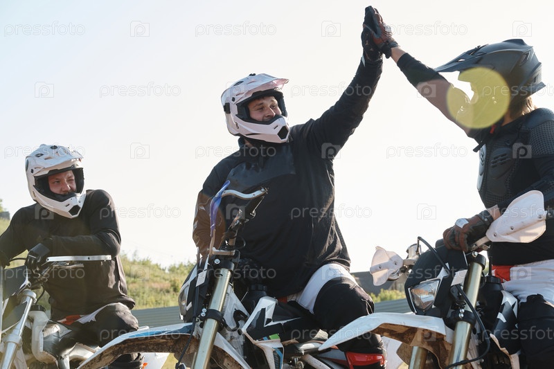 Взволнованные мотоциклисты дают высокую пятерку