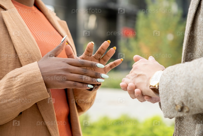 Руки молодой африканской бизнес-леди и ее коллеги во время разговора