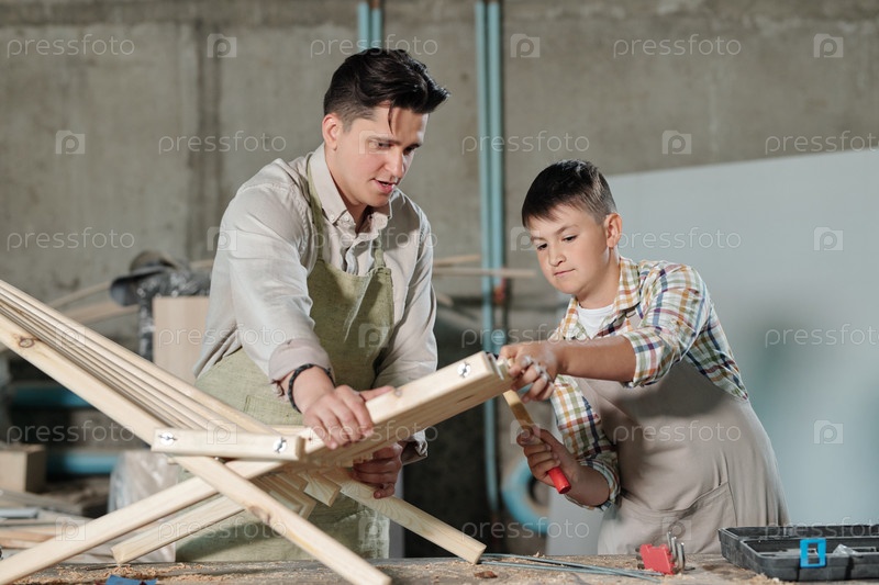 Опытный мальчик, работающий на деревянной мебели с отцом