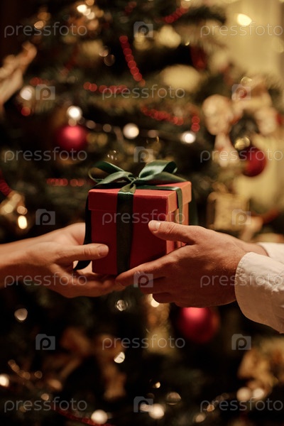 Руки молодой женщины, передающей своему мужу коробку с подарками, связанную темно-зеленой лентой