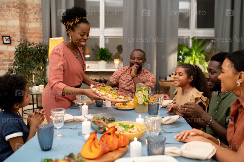 Молодая африканская женщина ставит аппетитные домашние бутерброды на праздничный стол