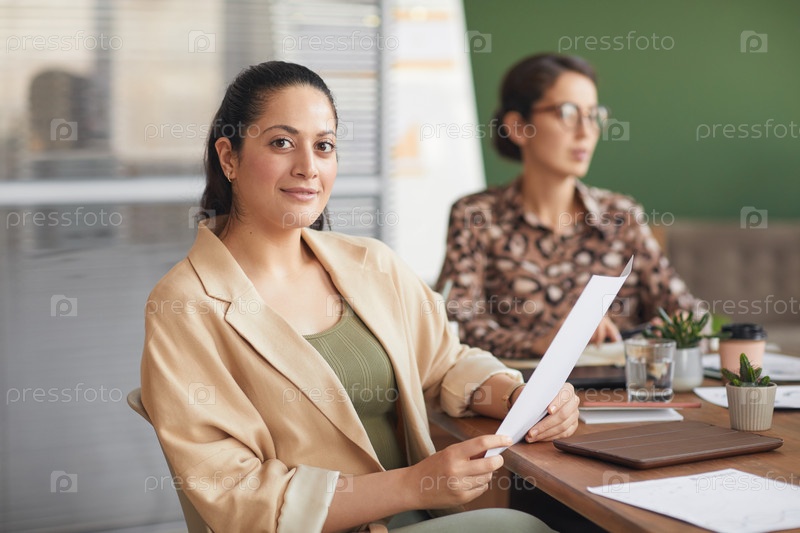 Современная деловая женщина смотрит на камеру во время встречи