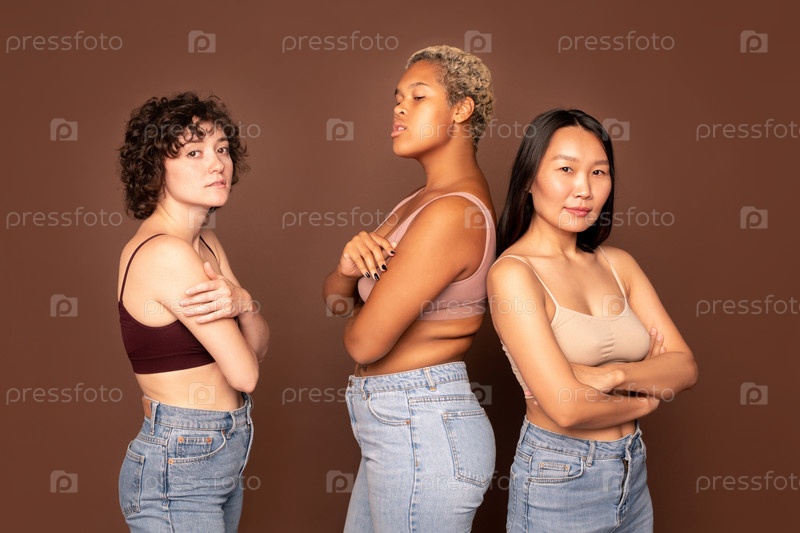 Группа молодых красивых женщин в танкорах и синих джинсах, стоящих в очереди