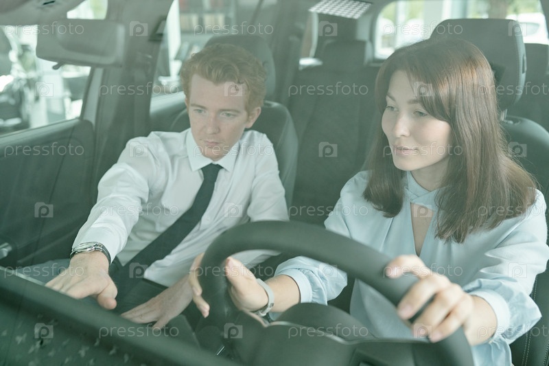 Молодая красивая брюнетка сидит в новой машине во время пробной езды с менеджером