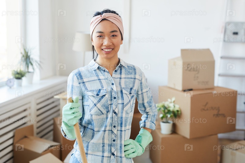 Молодая азиатская женщина позирует с инструментами для уборки в новом доме