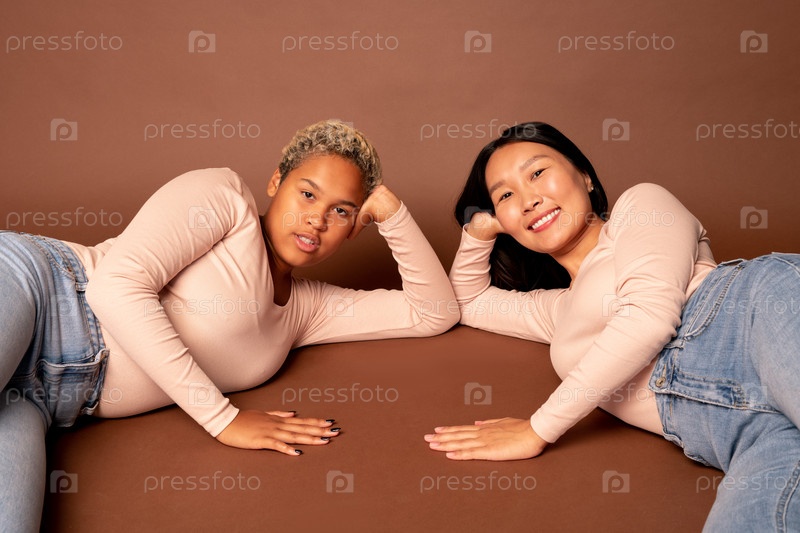 Две молодые современные женщины различной этнической принадлежности в джинсах и пуловерах