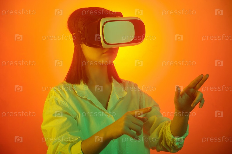 Студентка в VR гарнитуре, указывающая на виртуальный дисплей во время презентации