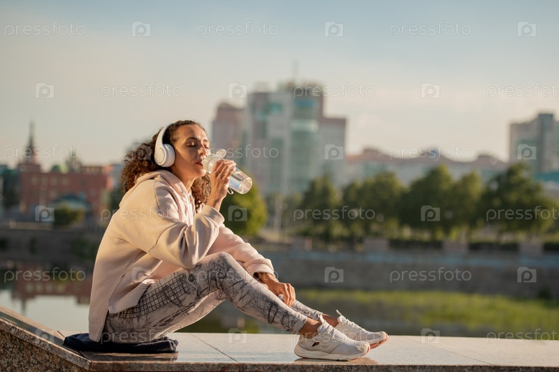 Отдыхающая жаждущая женщина в спортивной одежде пьет воду из бутылки на берегу реки