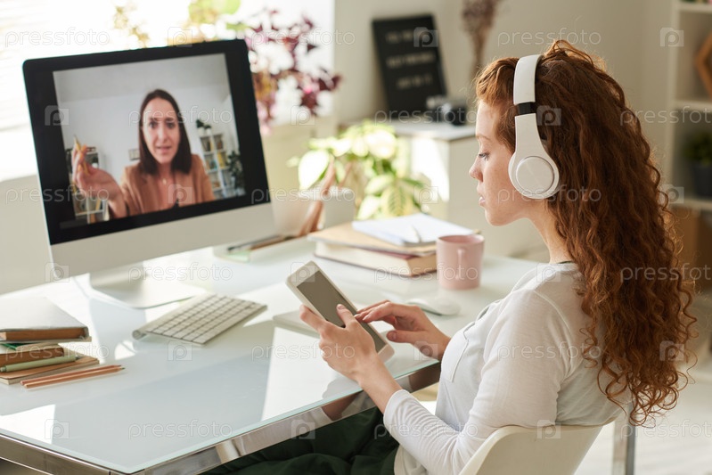 Концентрированная рыжеволосая студентка в наушниках, использующая планшет во время учебы с репетитором онлайн