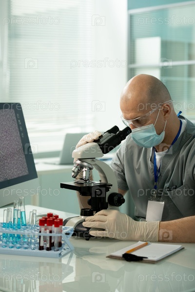 Мужчина-клиницист в защитной рабочей одежде изучает новую вакцину под микроскопом в лаборатории