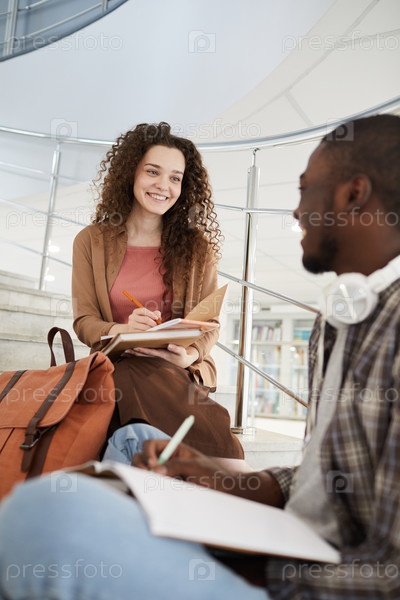 Улыбающаяся молодая женщина разговаривает с другом из школы