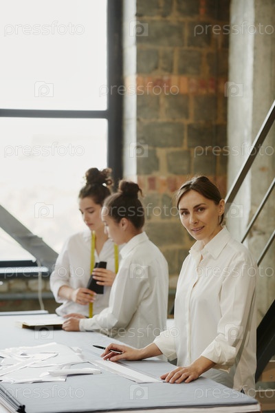 Молодой уверенный дизайнер одежды смотрит на вас, когда вы работаете за столом