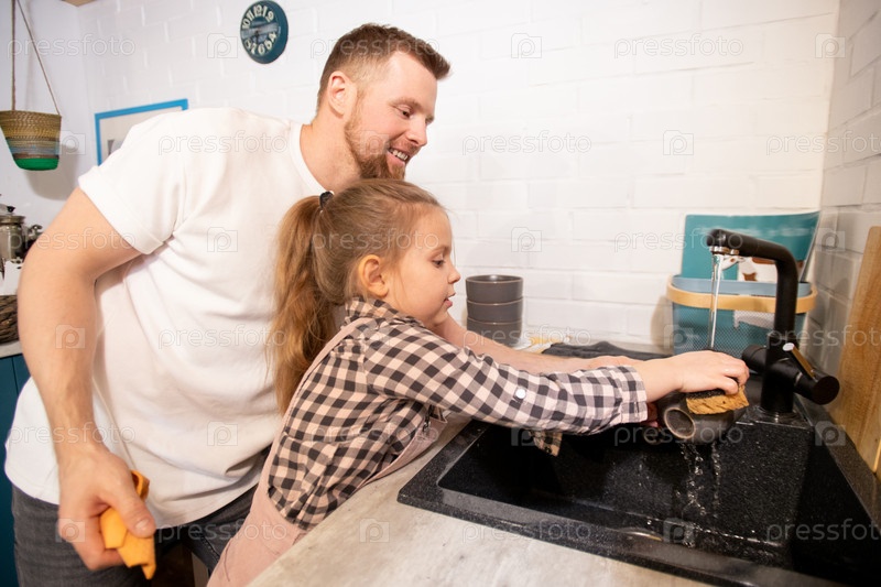 Счастливый молодой отец, стоящий рядом со своей маленькой дочерью и помогающий ей мыть чашки