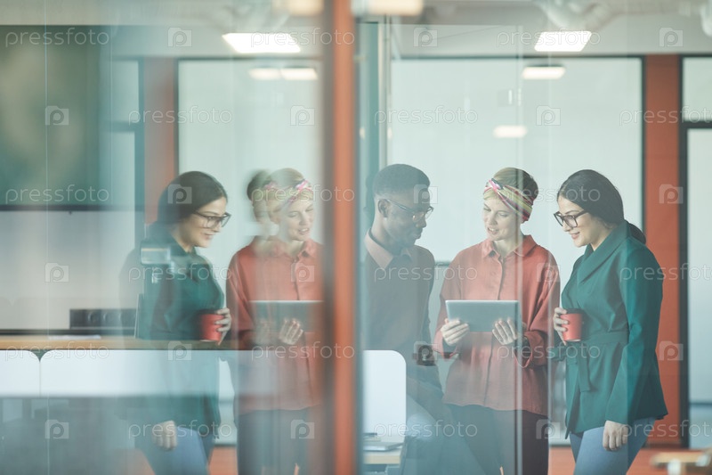 Молодая этническая команда за стеклом в современном офисе