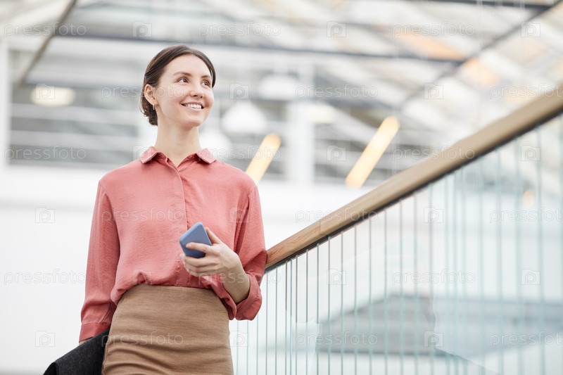 Улыбающаяся деловая женщина ходит по офисному зданию