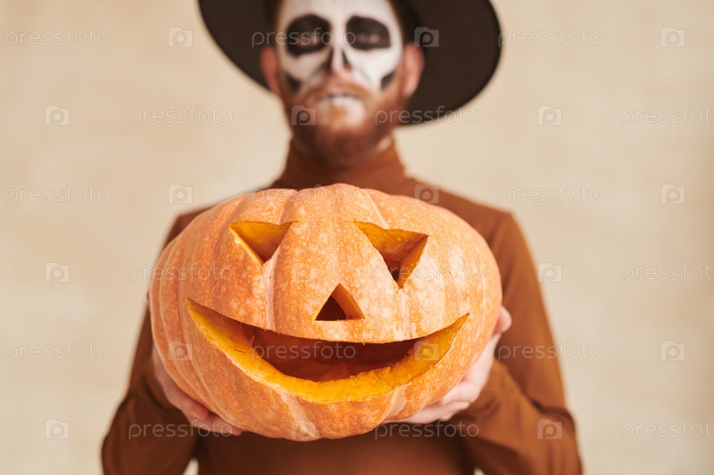 Близкий план бородатого мужчины в костюме колдуна, показывающий ручной сделанный фонарь jack-o-lantern, концепция Хэллоуина