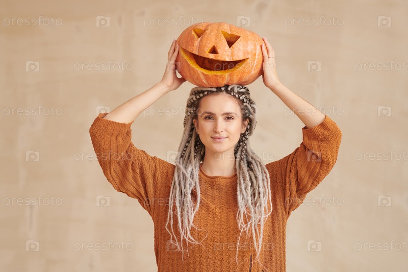 Портрет контента хипстерская девушка в повседневном свитере, держащая на голове тыкву Хэллоуина, позируя на бежевом фоне