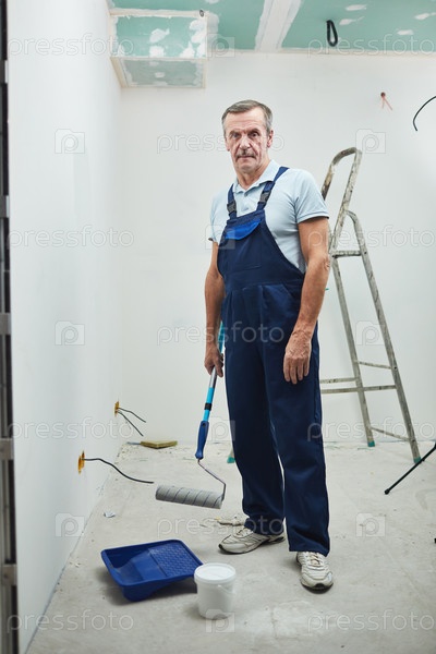 Старший работник, держащий ролик краски