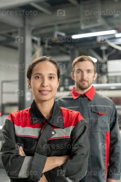 Молодая успешная женщина-лидер рабочей команды держит руки скрещенными к груди