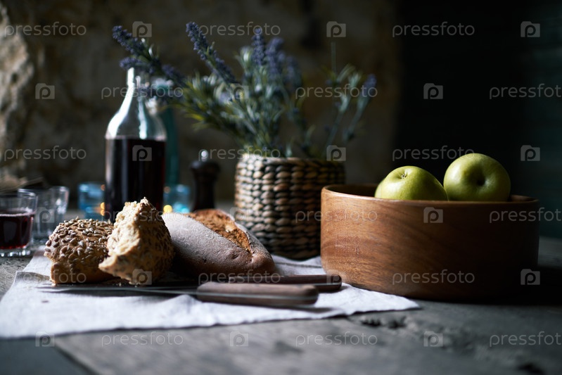 Свежий домашний хлеб и нож на салфетке, стеклянная посуда с красным вином