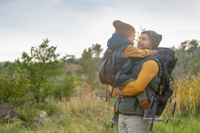 Молодой любящий отец с рюкзаком, который держит своего милого маленького сына на руках