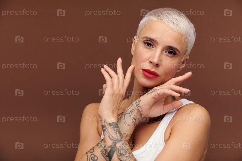 Зрелая блондинка с татуировками на руках, окружающей лицо руками