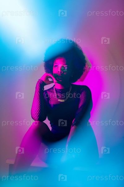 Молодая задумчивая женщина в черном платье сидит у стены среди голубого и розового огня