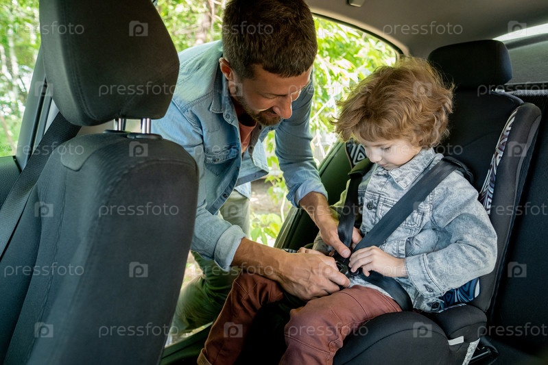 Молодой человек помогает своему милому маленькому сыну пристегнуть ремень безопасности во время поездки в деревню
